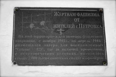 У роки окупації в селі Петрівка фашисти організували табір смерті «Сеплаг -123». Із спогадів Григорія Гори: « Під час окупації мені було лише 15 років, я тоді жив у селі Миролюбівка. Одного разу спекотним сухим літом я віз на конях бочку з водою для полонених. Виснажені, поранені, знесилені люди кинулися до води. У результаті їх натиску бочка не встояла і перекинулася. Дорогоцінна волога стала виливатися на суху землю. Утворилася калюжа. Нещасні кинулися до неї, сподіваючись хоч якось вгамувати спрагу. Почалася тиснява, кількох людей буквально втоптали в землю. Піднятися їм вже фашисти не дали». [6,c.211] У таборі « Сеплаг - 123» за час фашистської окупації знаходилося до 7 тисяч військовополонених, з них близько 2 тисяч були розстріляні, замучені, повішені. На чолі табору стояв комендант обер - лейтенант Ганс Гофман, безжальний, жорстокий фашист.[2, с. 38] Саме за його наказом на території «Сеплага - 123» були встановлені шибениці, саме за його розпорядженням чинилися жорстокі розправи над полоненими. Сам табір розташовувався на тому місці, де сьогодні знаходиться гараж «Дружби народів» (між церквою і вулицею Садовою у селі Петрівка). Табір діяв до визволення району в 1944 році. Материал подготовила Татьяна Сидоренко, выпускница 11-А класса | |